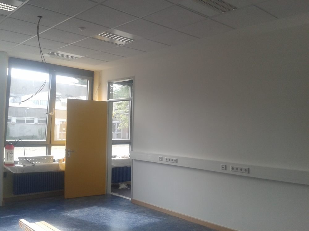 Einbau von Akustikdecke in der schule in Hilden - Trockenbauwände mit Gipskartonplatte KNAUF Diamantplatte, OWA-Decken mit Standard Oberflächen.
